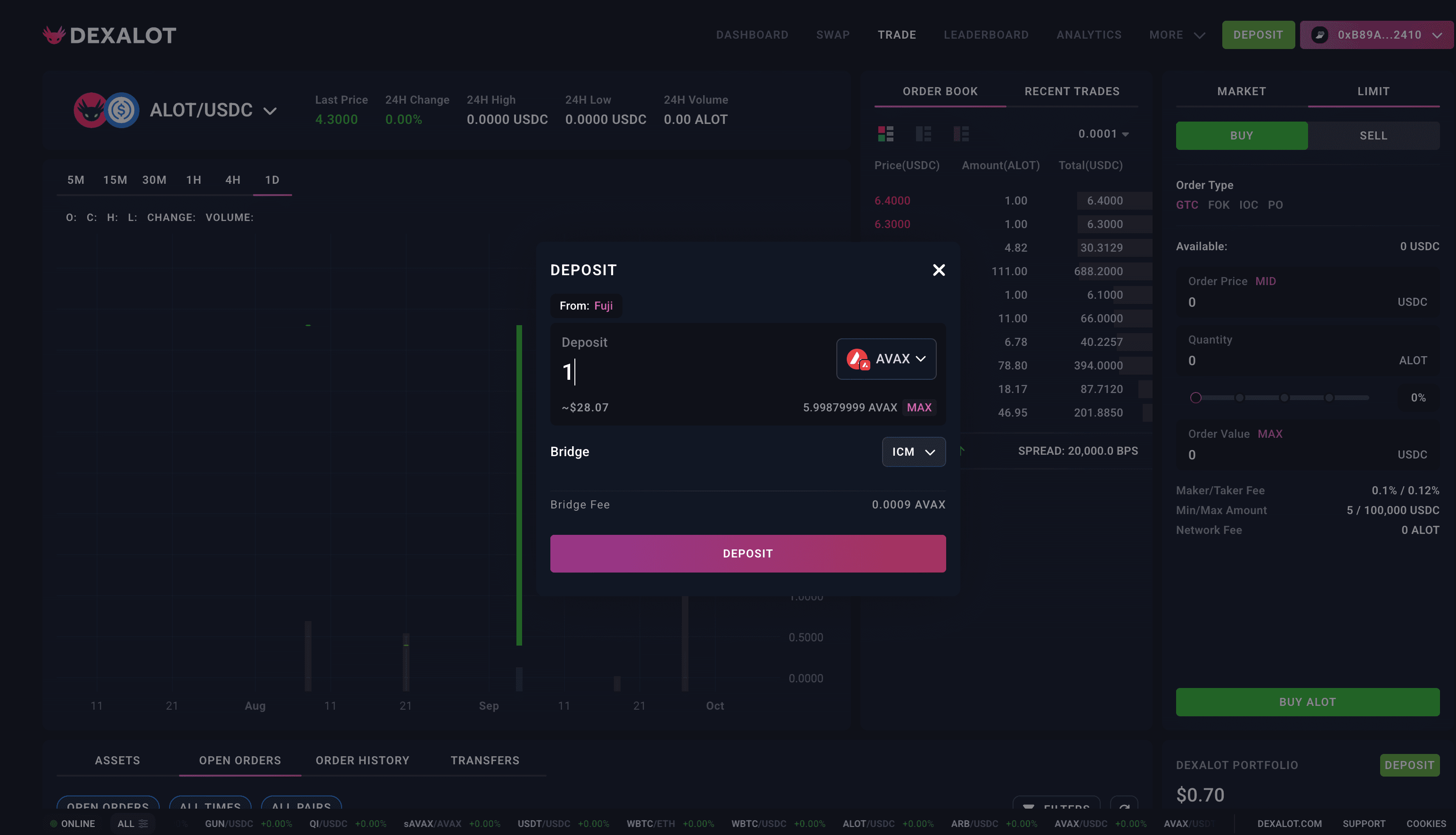 Head over to the Dexalot Testnet, connect your wallet (top right), and click on the Deposit button next to the pink icon with your connexted wallet. You will have to authenticate your wallet for the first time you interact with Dexalot.